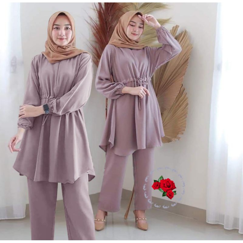 Beli baju setelan tunik celana wanita kekinian terbaru 2021 versi lebaran bahan moscrepe belli ye nom terbaru harga murah di shopee.